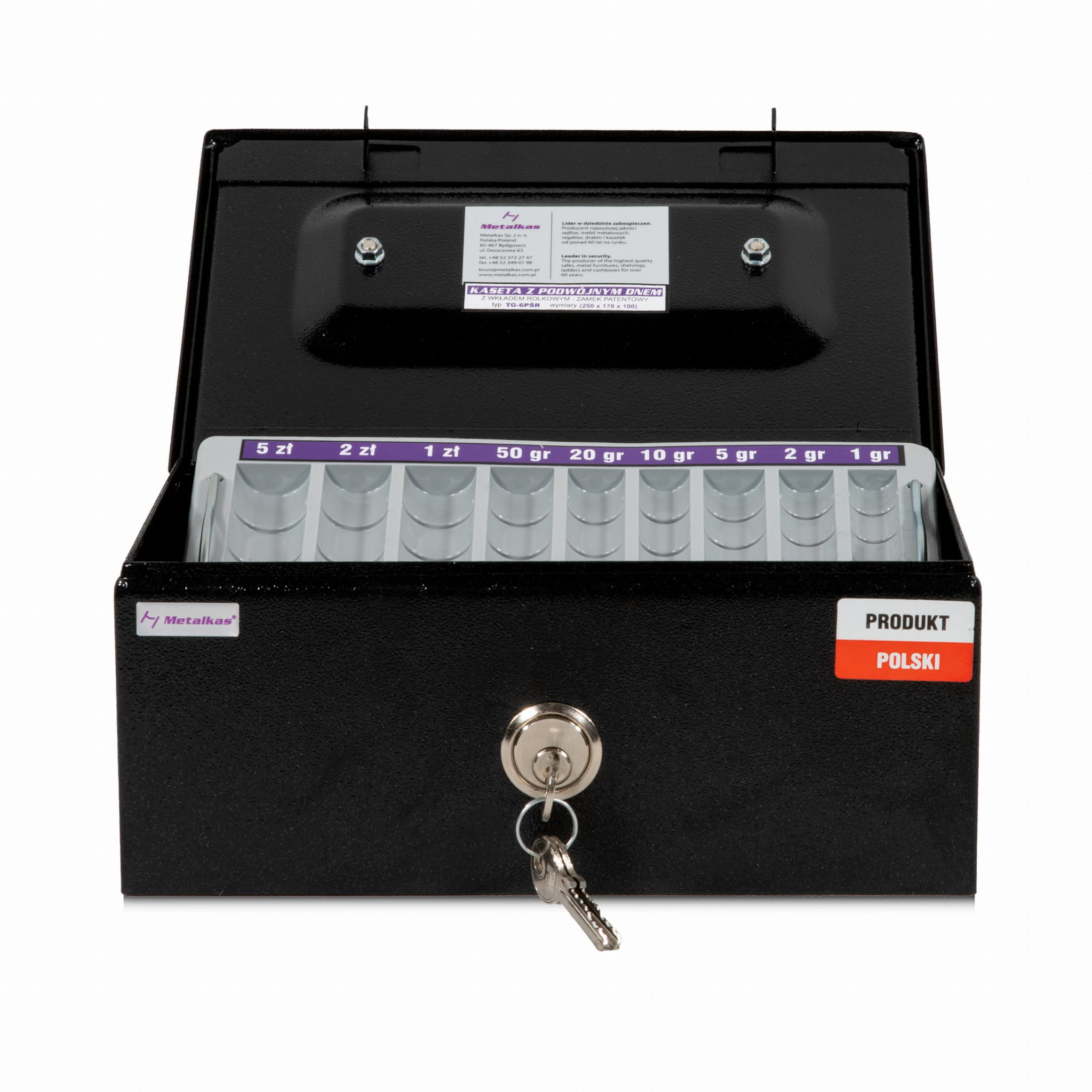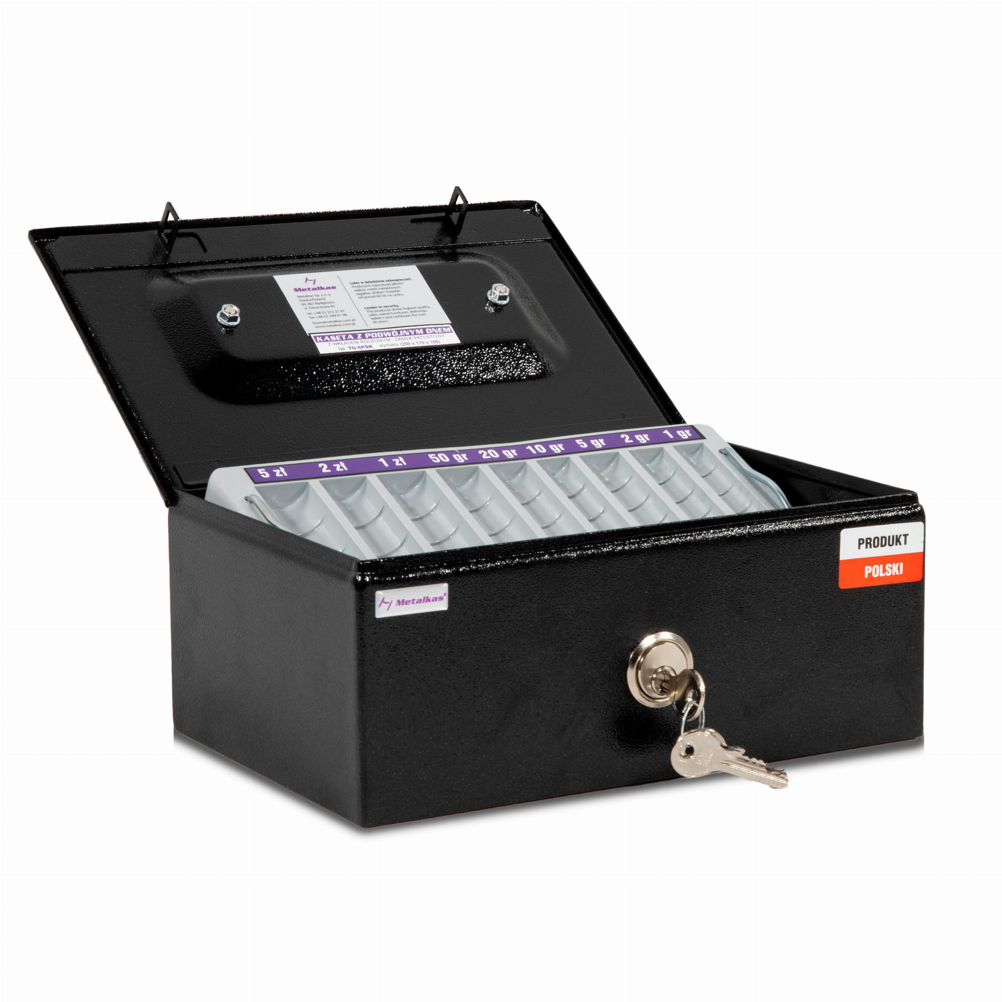 Kaseta wyposażona jest w zamki cylindryczne patentowe z mechanizmem ryglowym, co gwarantuje ochronę dostępu przed osobami niepowołanymi i bezpieczeństwo rzeczy przechowywanych. Dodatkowo, wkład na bilon pozwala na sprawną organizację i segregację pieniędzy, a dzięki temu, że jest wyjmowany, można wygodnie zmieniać przeznaczenie kasetki i przechowywać w niej dowolne przedmioty.