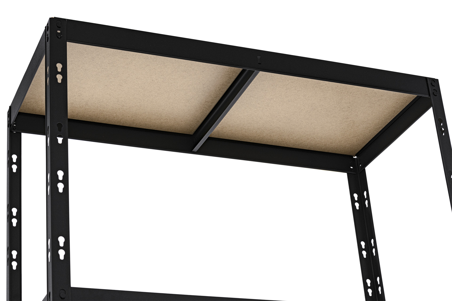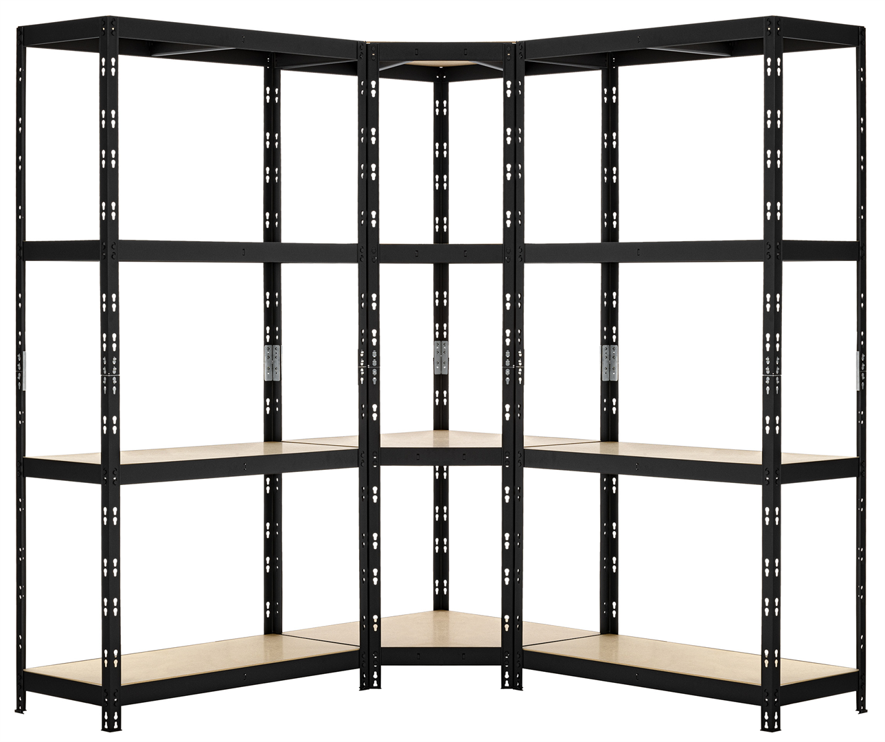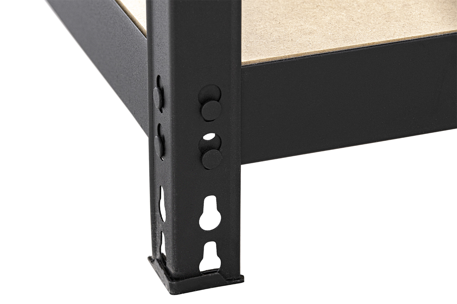 Regał metalowy CORNER posiada cztery regulowane półki wykonane z wysokiej jakości płyt HDF. Każda z nich ma nośność 175 kg i została dodatkowo wzmocniona poprzez montowany od dołu metalowy wspornik. Regał w całości został pomalowany proszkowo na czarny kolor. Ten sposób pokrycia mebla farbą gwarantuje jednolity nasycony kolor, który utrzyma się przez lata, a także ochronę przed korozją czy innymi uszkodzeniami mechanicznymi.