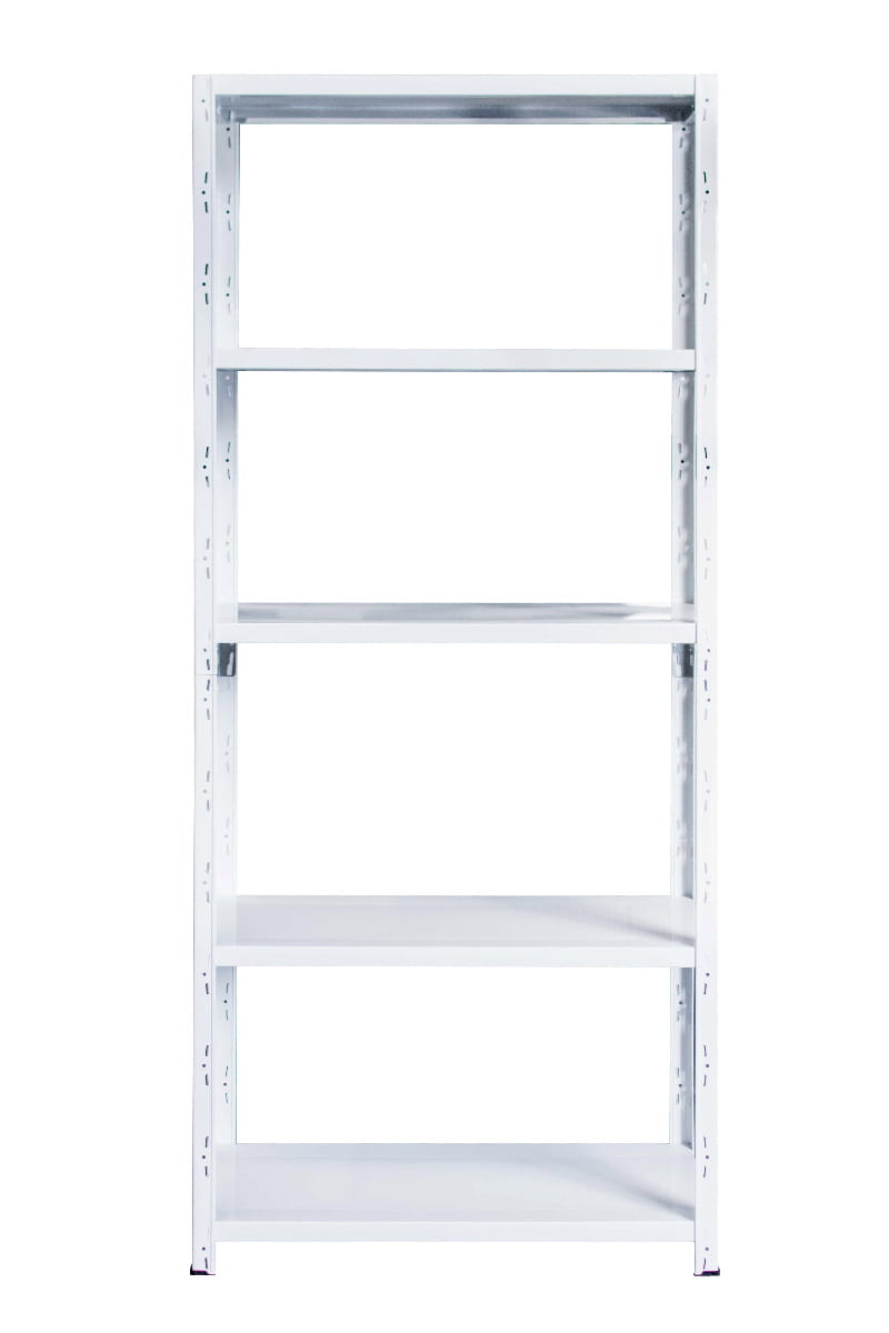 Jednolite pokrycie regału białą farbą proszkową nadaje mu stylowego wyglądu, dzięki czemu doskonale sprawdzi się on nie tylko w piwnicy czy garażu, ale także w biurze, kuchni, a nawet w salonie. Czarne stópki stanowią stabilną podstawę i zapobiegają ślizganiu się mebla.