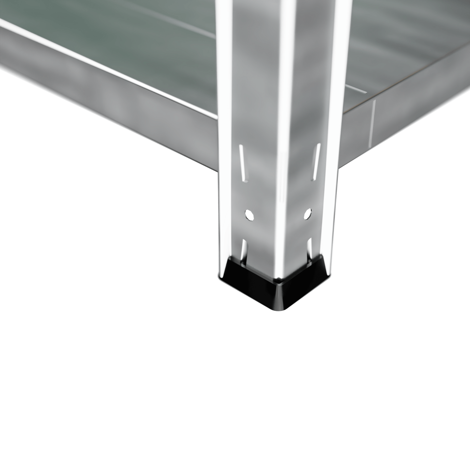 Ocynkowanie regału nadaje mu nieco surowy, ale nowoczesny i estetyczny wygląd, który pasuje do każdego wnętrza, zarówno roboczego czy gospodarczego, jak i mieszkalnego. Czarne stópki stanowią stabilną podstawę i zapobiegają ślizganiu się mebla.