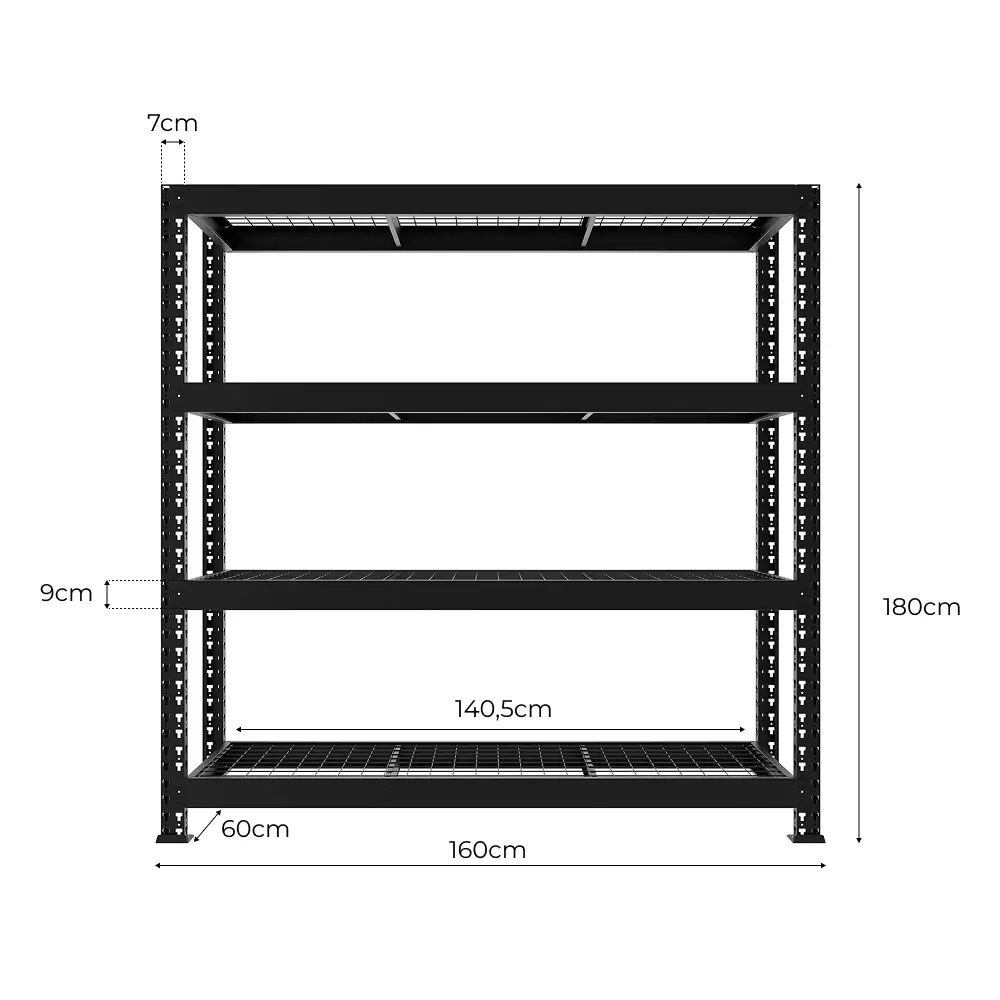 Wymiary regału Mega-Met to aż 180x160x60 cm co sprawia, że jest niezwykle pojemny i pozwoli na uporządkowanie każdej przestrzeni. Kratowana półka zapewnia regularną cyrkulację powietrza i zapobiega powstawaniu utrzymywaniu się wilgotności. Nośność każdej półki to 500 kg, oznacza to, że na jednym regale możesz umieścić przedmioty o łącznej wadze aż 2000kg! Nasz produkt znakomicie sprawdzi się w przestrzeniach magazynowych, warsztatach oraz innych miejscach, gdzie potrzebne są mocne i stabilne regały.