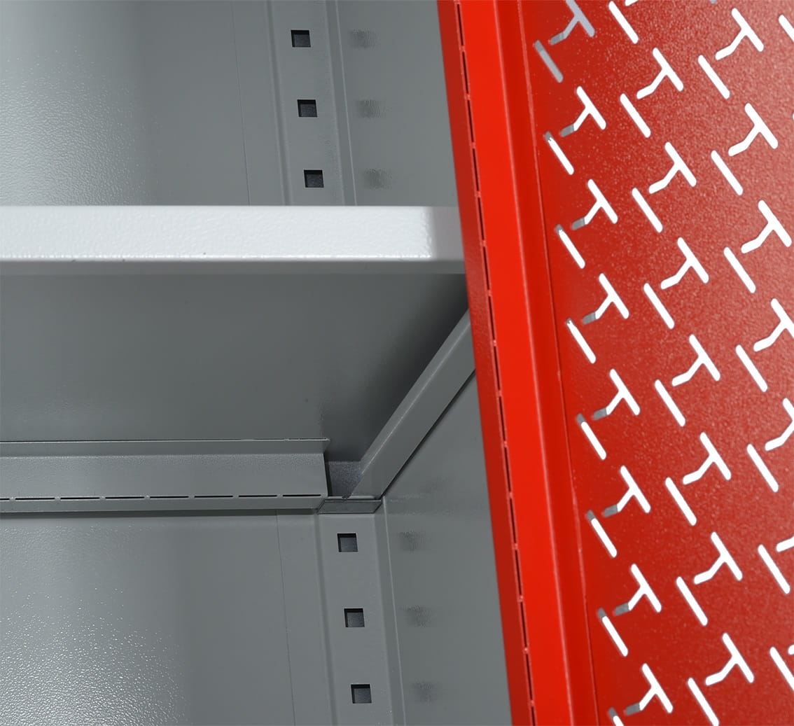 Z czterema regulowanymi półkami o maksymalnej nośności 50 kg każda, ta szafa oferuje wszechstronność przechowywania. Możliwość regulacji półek co 40 mm pozwala dostosować przestrzeń wewnątrz szafy do Twoich indywidualnych potrzeb. Idealnie dostosowany rozstaw wysokości półek sprawia, że pomieścisz w niej segregatory czy inne biurowe akcesoria.