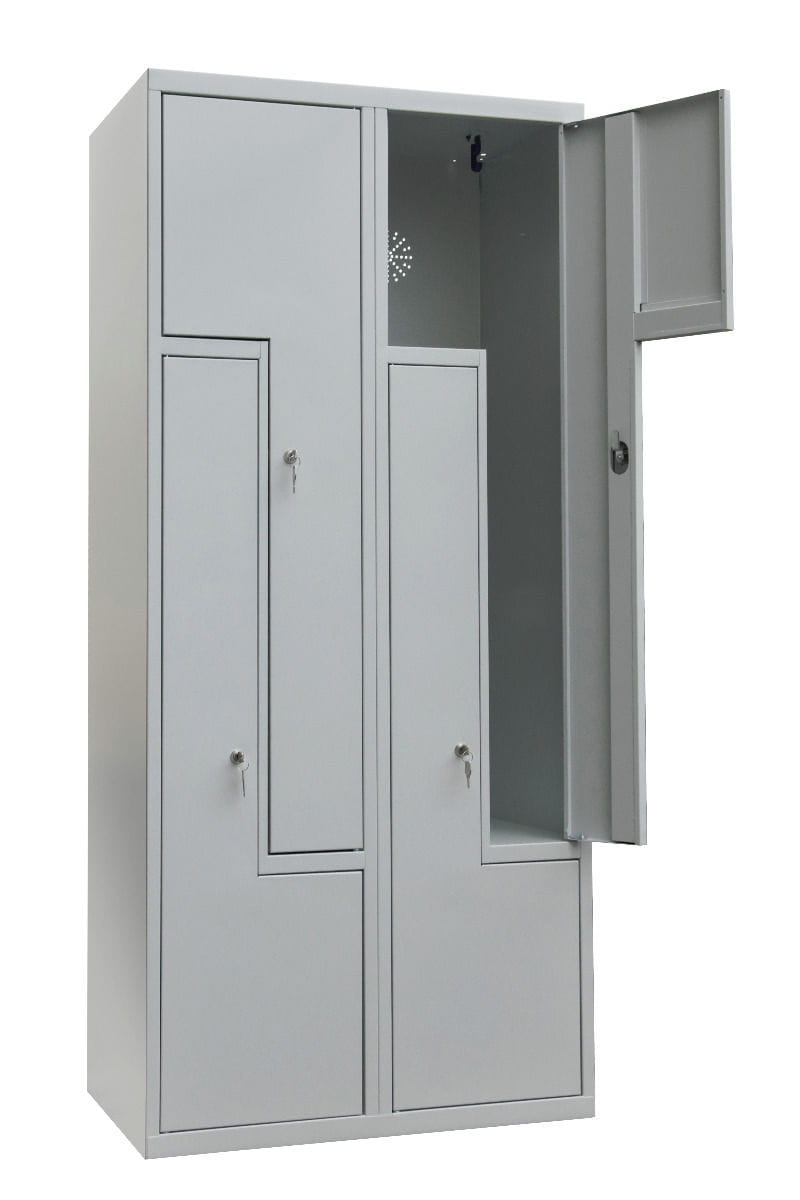 Szafa ubraniowa z drzwiami w kształcie litery „L”. Każda komora szafy wyposażona jest w haczyk ubraniowy. Wydajny system otworów wentylacyjnych znajduje się w tyle szafy. Drzwi zamykane zamkiem cylindrycznym z ryglowaniem jednopunktowym. Szafa wykonana z blachy 0,6-0,8mm.